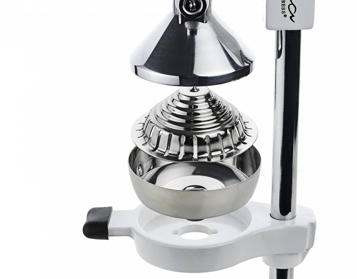 Dacă aveți nevoie de suc rapid, presa de citrice Sana este calea de urmat. Doar tăiați citricele sau rodiile în jumătate, puneti-le pe conul din oțel inoxidabil, puneți paharul sub presă și trageți de mâner. Imediat ai suc în pahar - nu este necesară decojirea. Și curățarea este și mai ușoară. Pur și simplu ștergeți „pălăria” din oțel inoxidabil și clătiți vasul de suc și conul. Puteți pune conul și bolul în mașina de spălat vase, deoarece sunt fabricate din oțel inoxidabil. Este într-adevăr cel mai rapid mod de a obține un pahar de suc proaspăt și este prefect la micul dejun, când timpul este limitat.